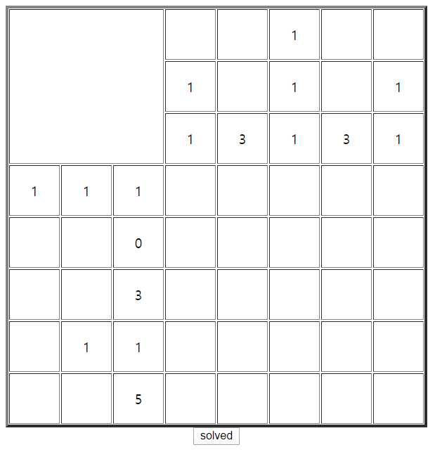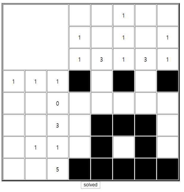 흰색타일을 누르면 검정색 타일로 색칠이 된다. 퍼즐을 풀어 solved 버튼을 누르면 아마 퀴즈를 풀 수 있는 형태인 것같다.