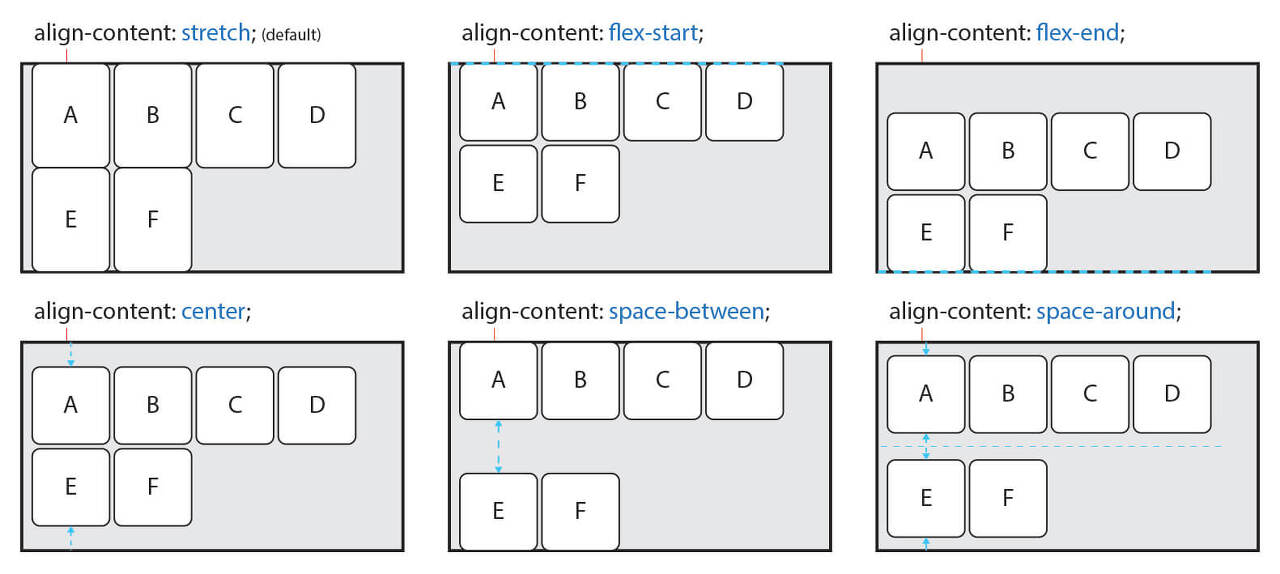 | align-content | 교차 축(cross-axis)의 정렬 방법을 설정(2줄 이상) |