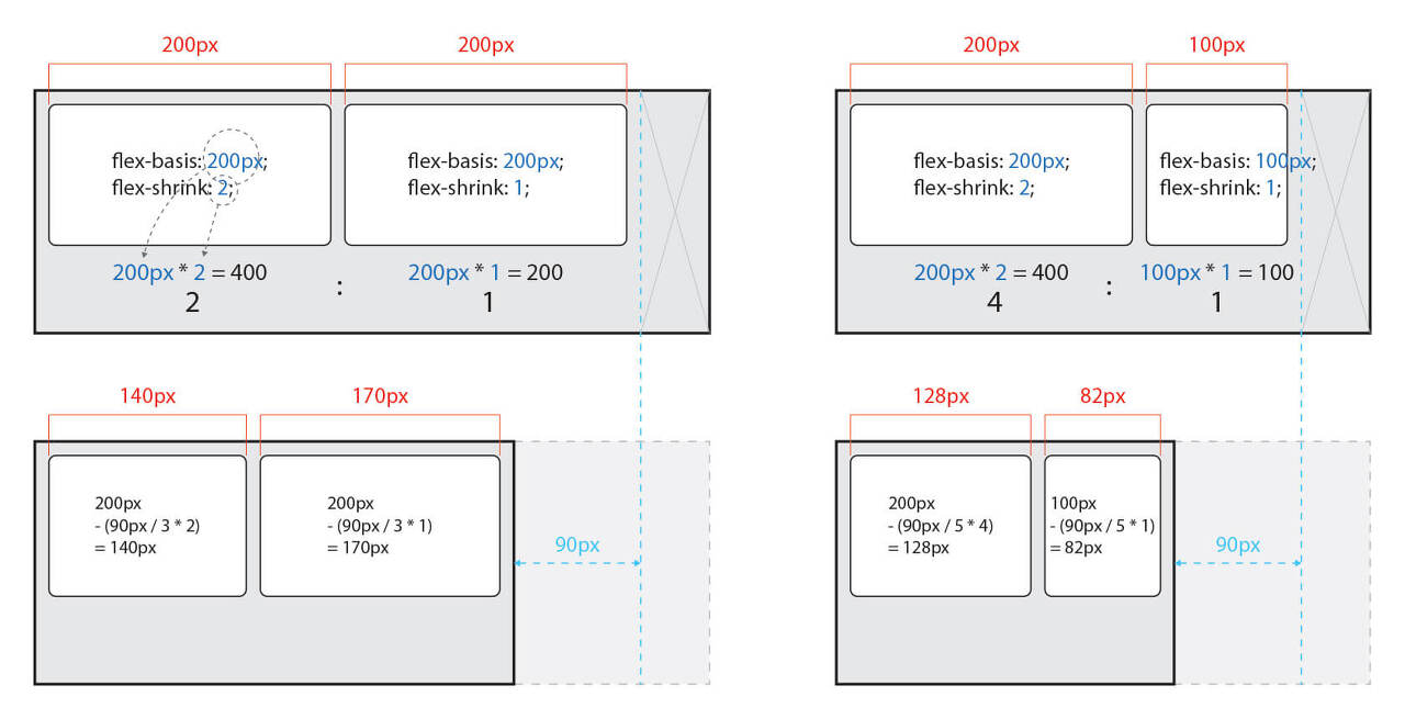 감소 너비(flex-shrink)는 요소의 너비에 영향을 받기 때문에 계산하기 까다롭다.