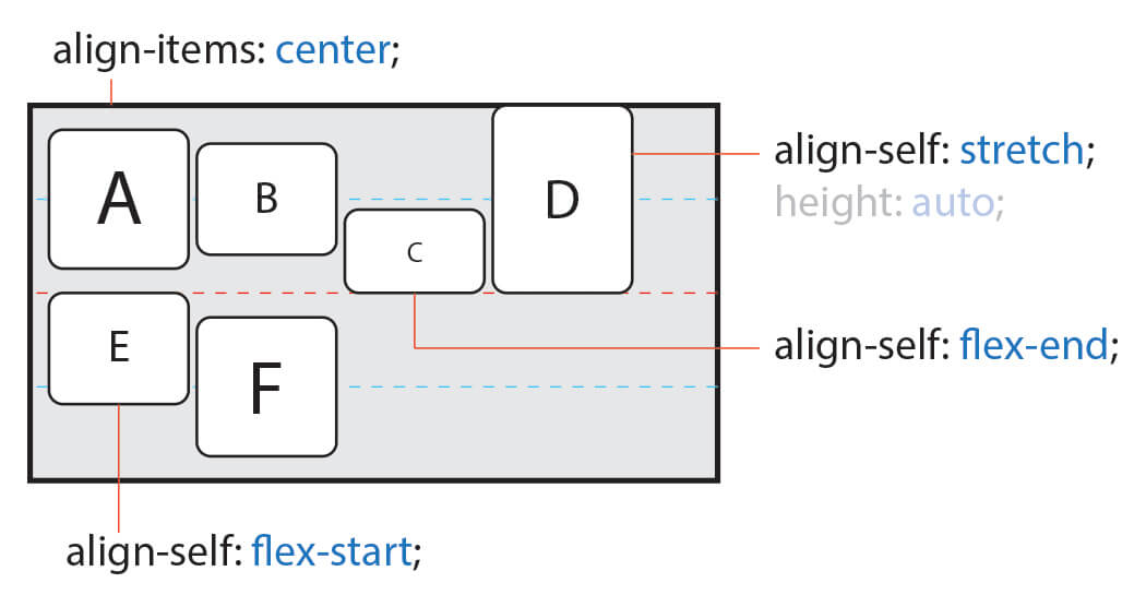 - 필요에 의해 일부 Item만 정렬 방법을 변경하려고 할 경우 align-self를 사용할 수 있다.