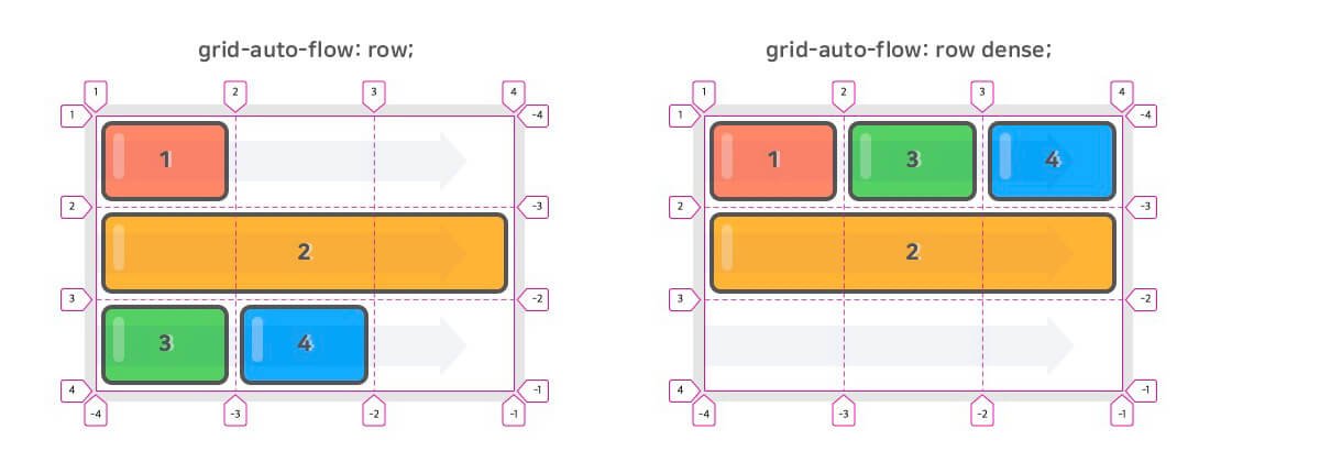 | grid-auto-flow | 자동 배치 알고리즘 방식을 정의 |