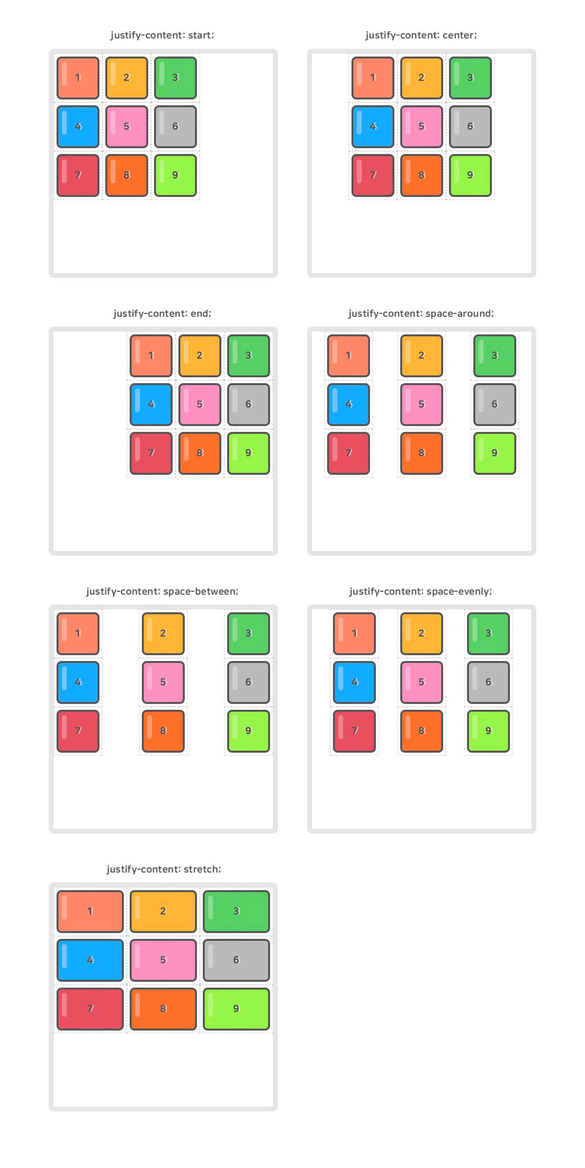 | justify-content | 그리드 콘텐츠를 수평(행 축) 정렬 |