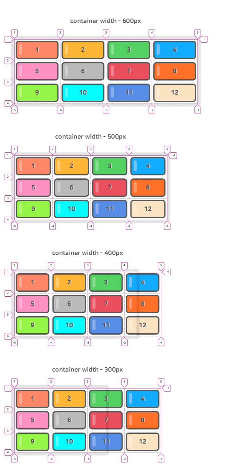- 예시 : 4컬럼 그리드 예제에서 컨테이너의 크기가 아이템들을 수용하기 충분하지 않은 경우 아이템은 넘치기 시작한다.