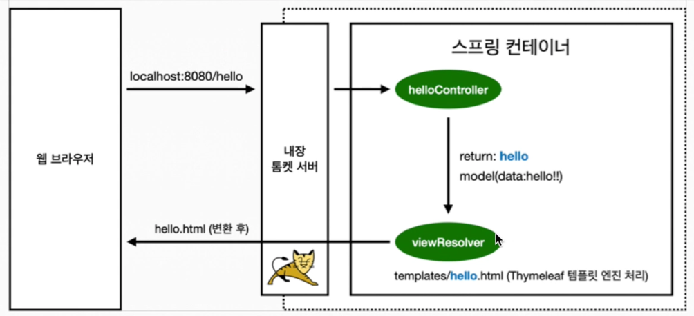 - 컨트롤러에서 리턴 값으로 문자를 반환하면 뷰 리졸버('viewResolver')가 화면을 찾아서 처리한다.