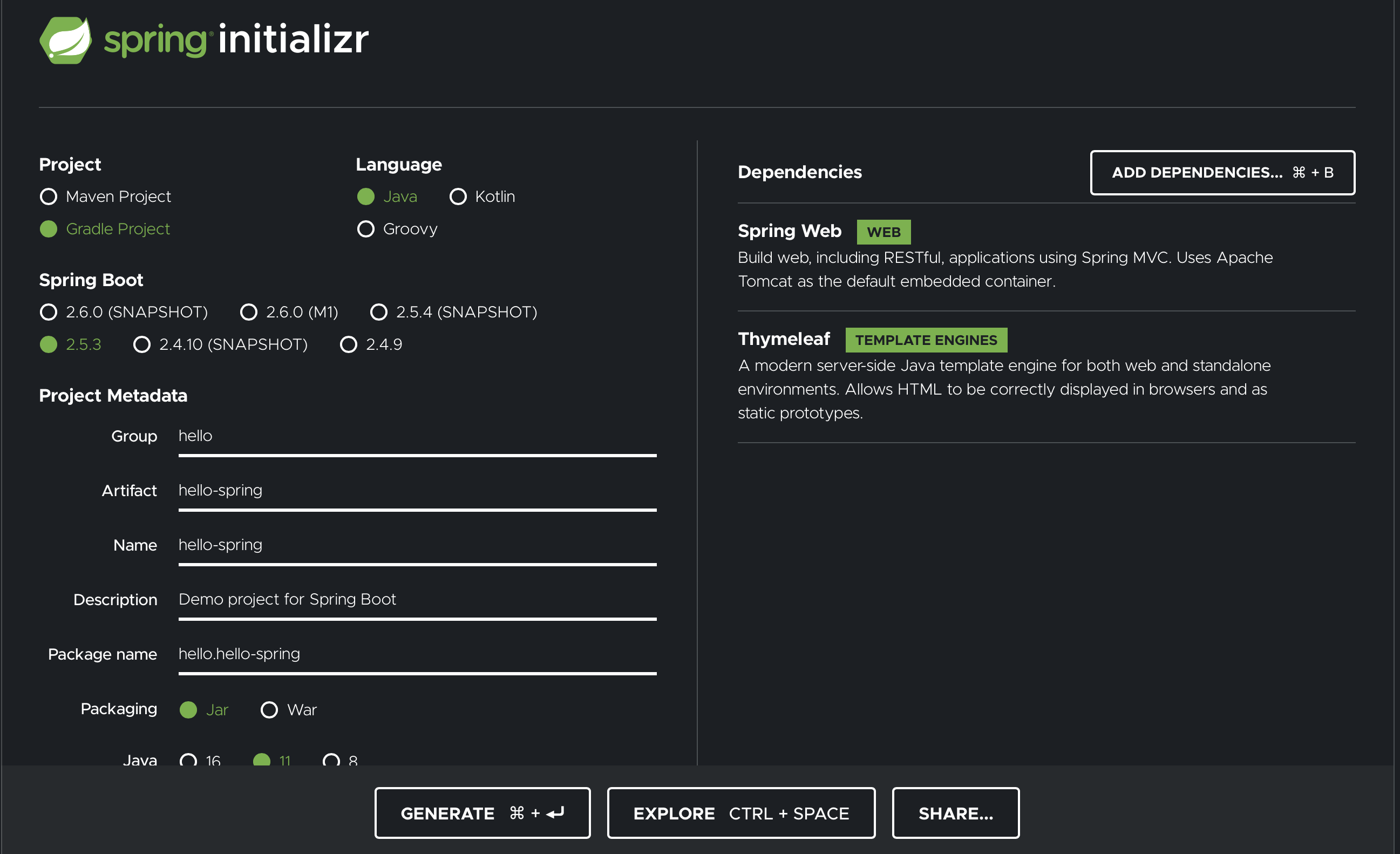 스프링 부터 스타터 사이트에 가서 아래의 설정대로 스프링 프로젝트생성