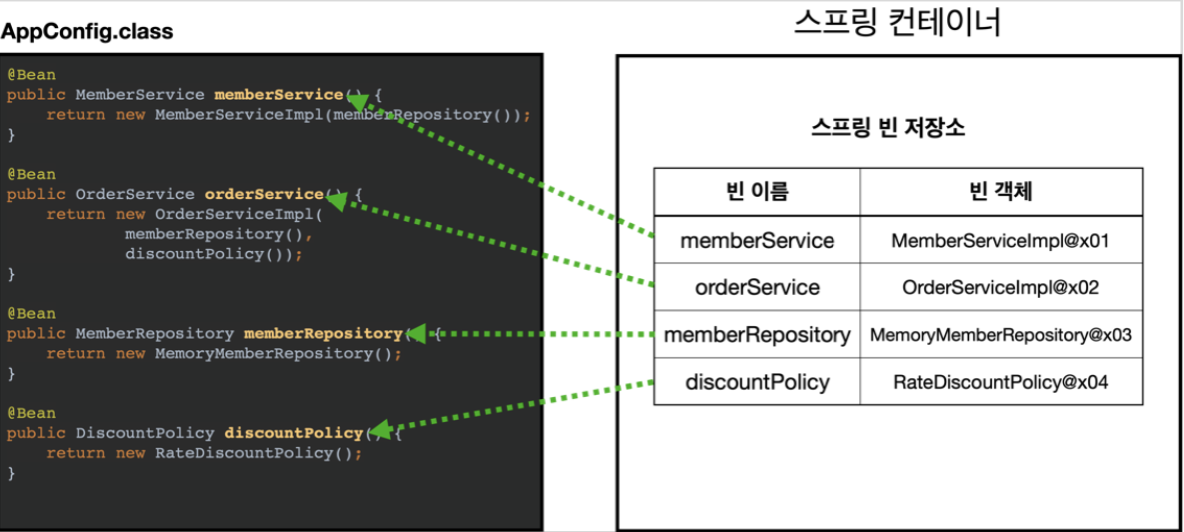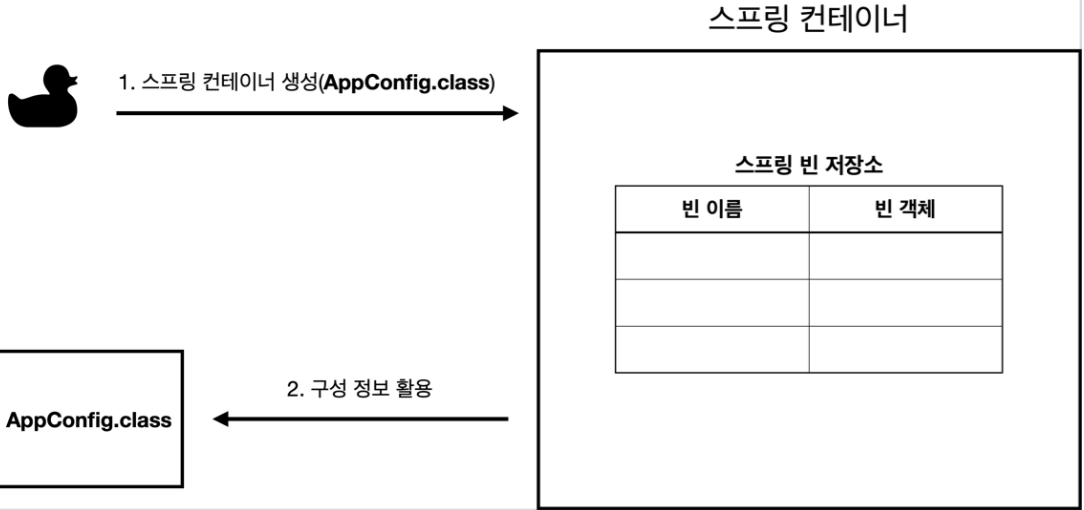 - 스프링 컨테이너는 파라미터로 넘어온 설정 클래스 정보를 사용해서 스프링 빈을 등록한다.