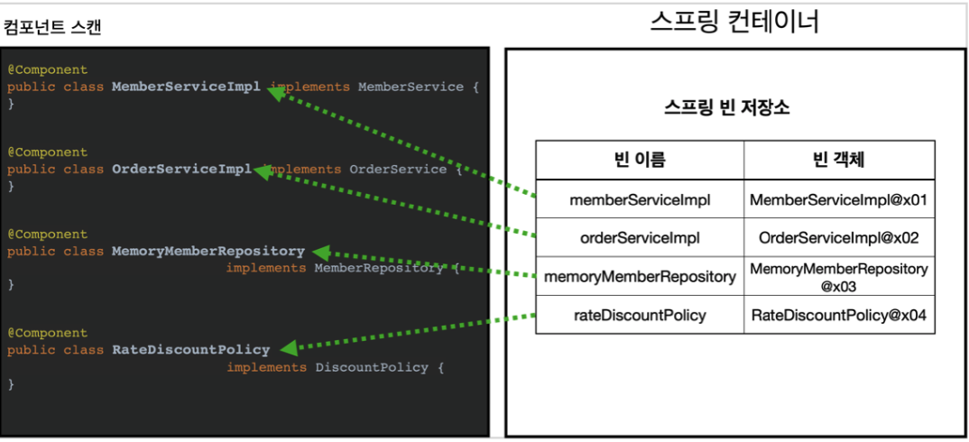 - @ComponentScan은 @Component가 붙은 모든 클래스를 스프링 빈으로 등록한다.