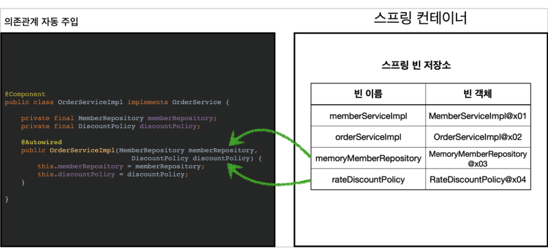 - 이전에 AppConfig에서는 @Bean으로 직접 설정 정보를 설정했고, 의존관계도 직접 명시했다. 이제는 이런 설정 정보 자체가 없기 때문에, 의존관계 주입도 이 클래스 안에서 해결해야한다.