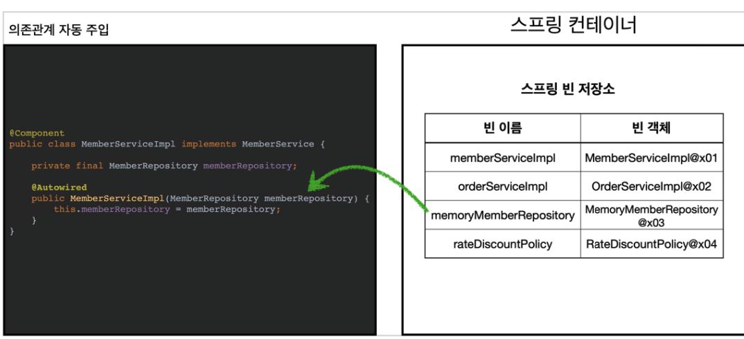 - 또 의존관계도 자동으로 주입하는 @Autowired라는 기능도 제공한다.