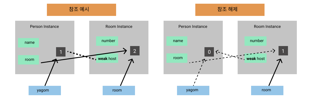 yagom = nil // Person 인스턴스의 참조횟수 :0, Room 인스턴스의 참조 횟수 : 1