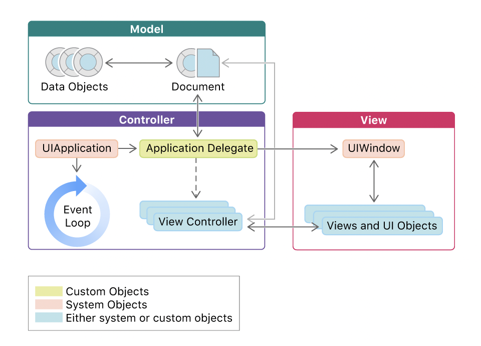 - UIKit은 앱의 메인 이벤트 루프를 실행하고 화면에 컨텐츠를 표시하며 여러 오브젝트를 제공하는데, 앱의 구조는 MVC(Model-View-Controller) 디자인 패턴을 기반으로 한다.