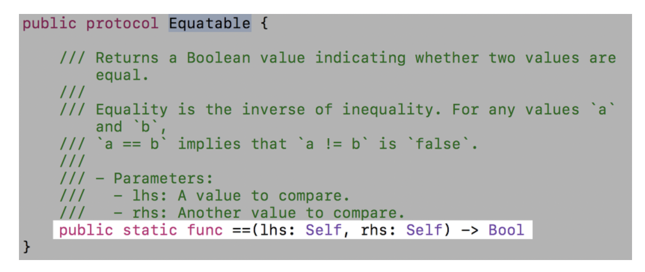 - Equatable 프로토콜을 준수하는 타입은 등로 연산자(==) 또는 같지 않음 연산지 ( !=)를 사용하여 동등성을 비교할 수 있습니다. 스위프트 표준 라이브러리의 대부분 기본데이터 타입은 Equatable을 따릅니다.