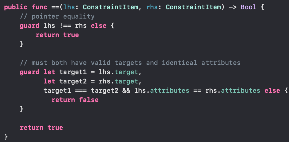 - 아래의 func을 사용해서 Equatable이 아닌 클래스들을 비교할 수 있다고 합니다! (데이터 타입들은 Equatable을 채택하고 있지만, 클래스들은 Equatable 프로토콜을 준수하고 있지 않기에 클래스가 같은지 비교를 할려면 아래의 식을 사용해야합니다..!